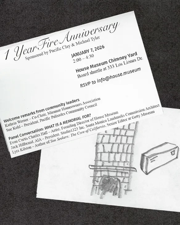 On January 7, 2026 House Museum and Pacific Palisades community leaders gathered to commemorate loss and celebrate progress at the Chimney Yard, where six salvaged chimneys are being temporarily stored.