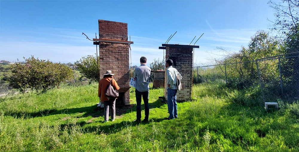 Getty Conservation Institute visits House Museum's intermediary storage location, the Chimney Yard in Pacific Palisades, California. Getty staff included Susan Macdonald, Head of Buildings and Sites, Elena Macchioni, Project Specialist, and Benjamin Marcus, Project Specialist. The site visit resulted in a comprehensive conservation assemessment and action plan to support the sustainability of the salvaged Palisades Fire chimneys.