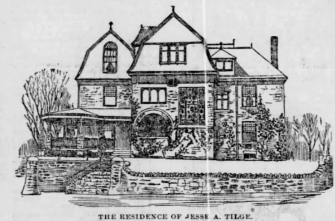 “It is built of gray stone, in architecture Queen Anne, with here and there a suggestion of Gothic and Colonial; thus, the roof, supported by carved wooden pillars resting on a stone base, is Colonial in design, while the vestibule of stone suggests Gothic ideas. In any description of general effect of Mr. Tilge’s place, the velvety turf, the shrubberies and the splendid trees, to which the slopes and inequalities of the ground give a fine effect; the luxurious creepers climbing up the walls and fences; the ivy which the climate allows to grow almost in perfection, must not be forgotten.” Inquirer, 1893